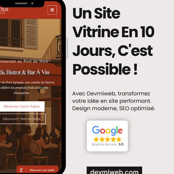 Vous cherchez une agence web à Nice pour créer ou améliorer votre site internet ? Devmiweb accompagne les TPE et PME de la Côte d'Azur avec des solutions WordPress claires, sans jargon et sans mauvaise surprise. Basés à Nice, nous intervenons sur la création de sites vitrine, le référencement local (SEO) et la visibilité Google (Google My Business) pour que vos clients vous trouvent avant vos concurrents. Nos formules en abonnement mensuel incluent la maintenance, les mises à jour et le support, pour que vous n'ayez rien à gérer techniquement. Résultat : un site professionnel, visible localement, et un interlocuteur unique disponible sur la durée.