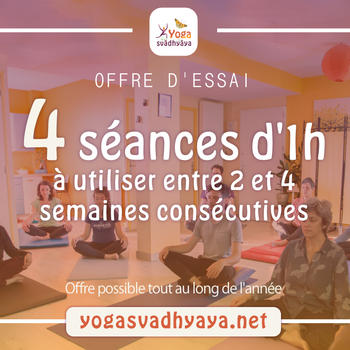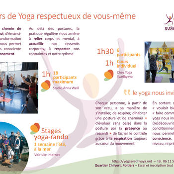 Cours de yoga traditionnel, respectueux de votre rythme et vos contraintes loin de la performance et la compétition. Renforcement musculaire, assouplissements, en lien avec la respiration au cœur de chaque mouvement. Enchainements de postures guidées, relaxation, médiation. Séances les midis, soirées et fin de matinées. Abonnement à l'année (cours manqués récupérables). Carte 5 et 10 (valables 3 et 6 mois). Offre d'essai de 4 séances. La posture parfaite est celle dans laquelle vous êtes confortable, pas celle des magazines. Il n'y a pas une posture idéale mais autant de postures qu'il y a de corps et d'histoire de vie. Témoignages d'élèves sur YogaSvadhyaya.net A Poitiers, au studio Anna Weill quartier Chilvert. Professeure diplômée de l'Institut Français de Yoga Paris (4 ans).
